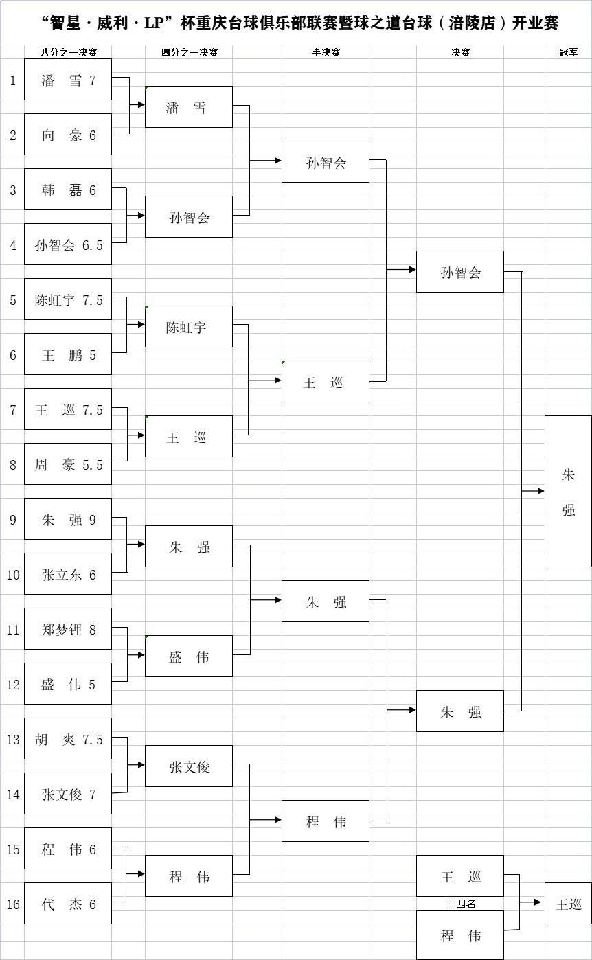 决赛,孙智会先发制人2:0取得开门红,朱强稳扎稳打凭借自己在中盘优势将比分追平,朱强感觉自己状态不佳随即叫了暂停,通过短暂的休息调整,朱强中盘大师的名号也非浪得虚名,节奏牢牢把握,使孙智会无从应对,朱强以惊人的连胜9局的出色发挥9:2完胜孙智会结束比赛,最终,朱强荣获“智星·威利·LP”杯重庆台球俱乐部联赛(涪陵站)冠军!