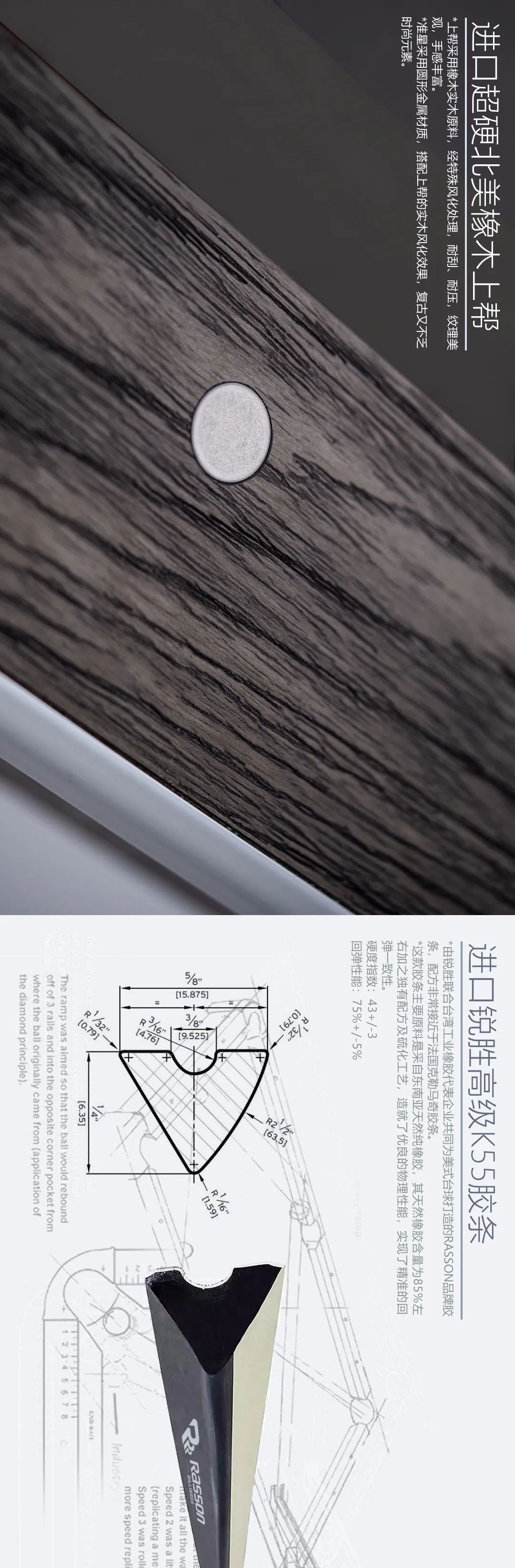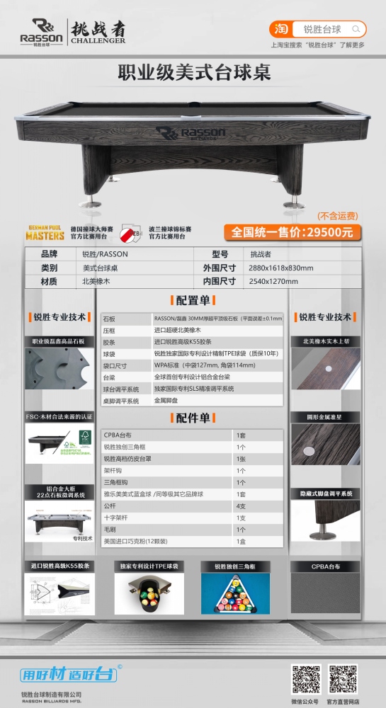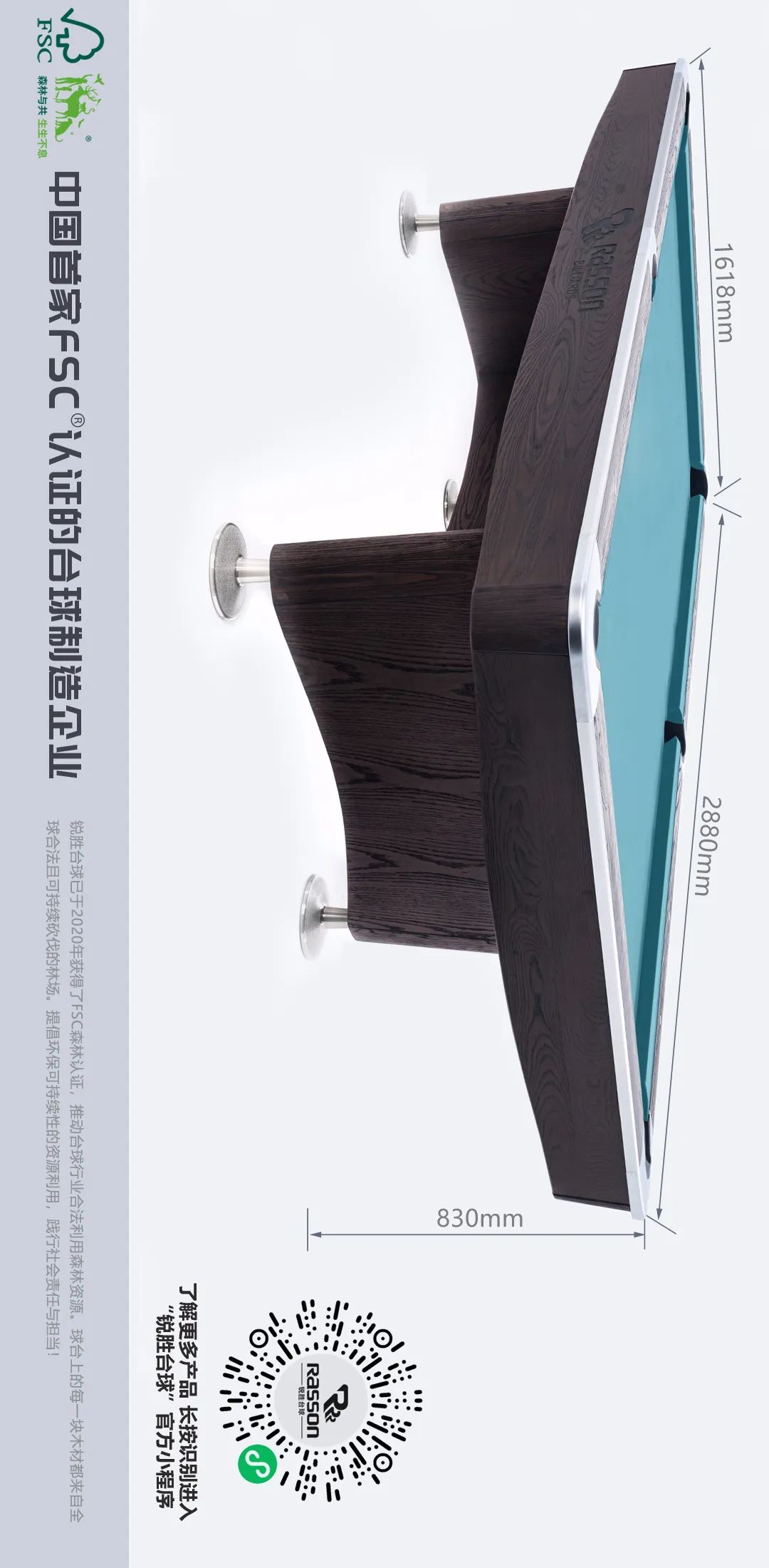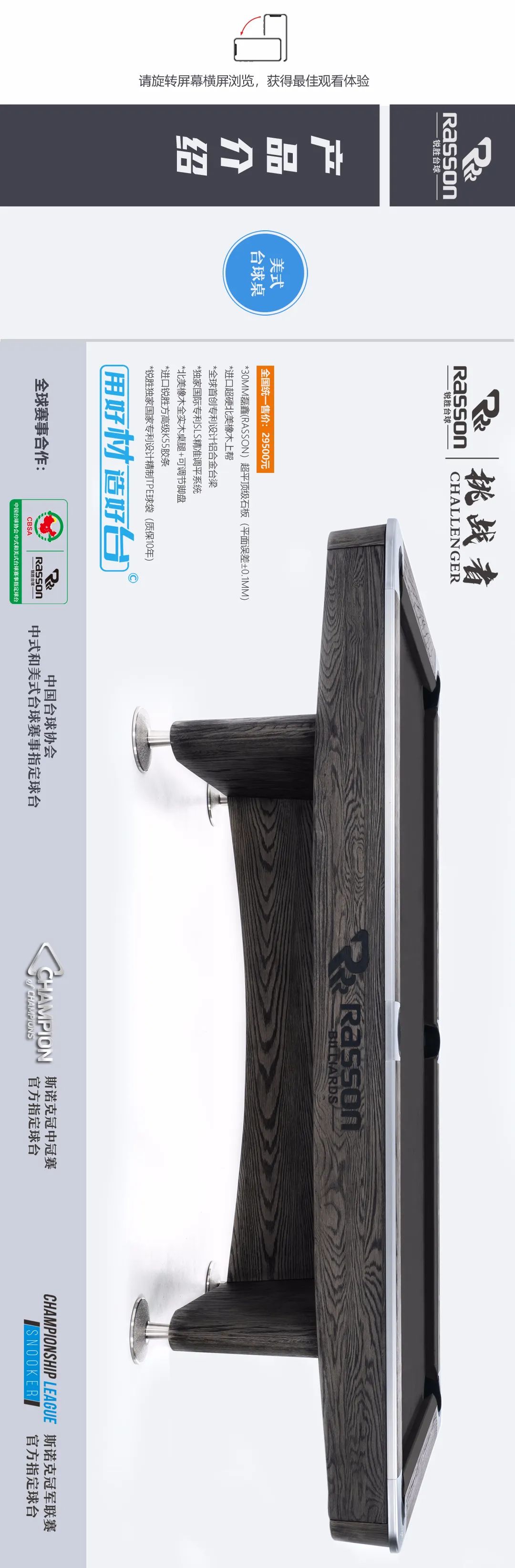 品牌:锐胜 型号:挑战者 类别:美式台球桌 外围尺寸:2880x1618x830mm 内围尺寸:2540x1270mm 材质:北美橡木