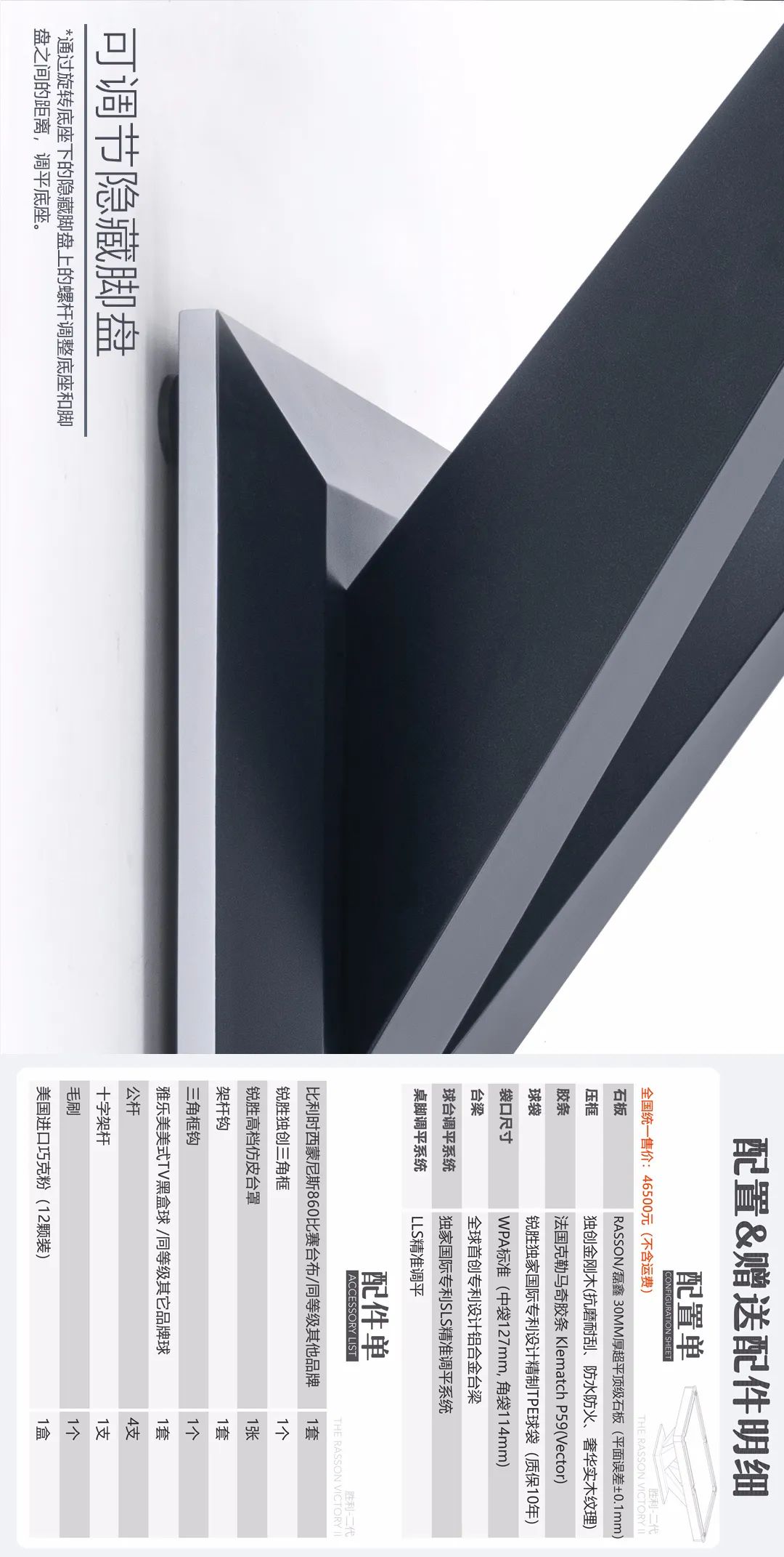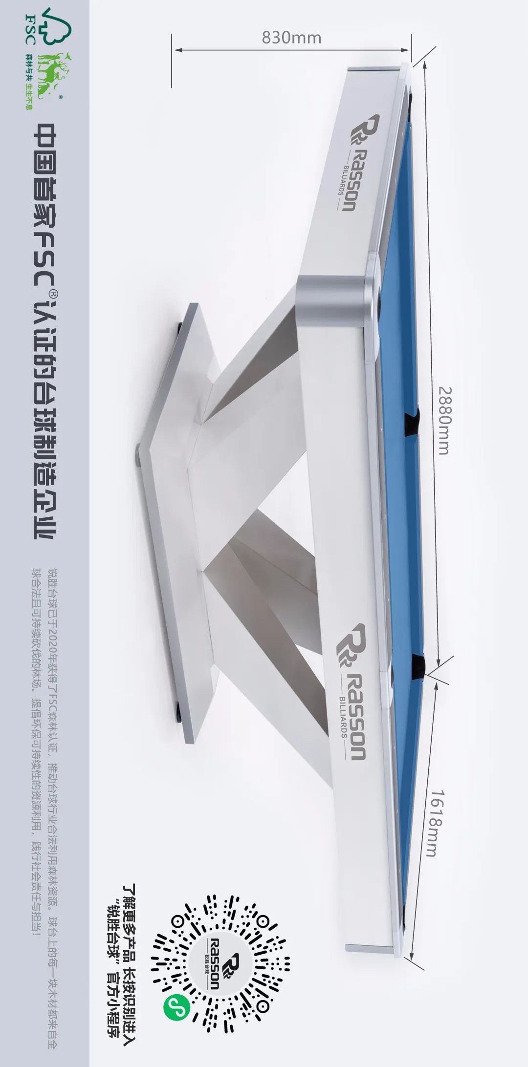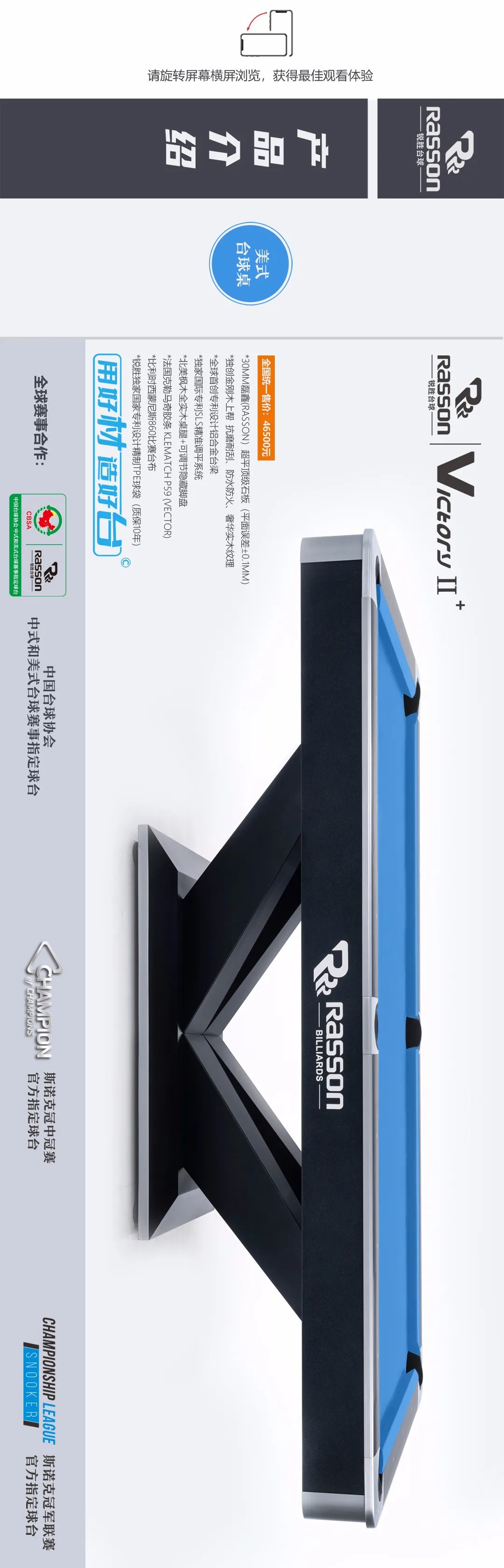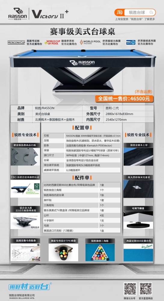 品牌:锐胜 型号:胜利-二代 类别:美式台球桌 外围尺寸:2880x1618x830mm 内围尺寸:2540x1270mm 材质:北美枫木+泰国橡胶木+金刚木
