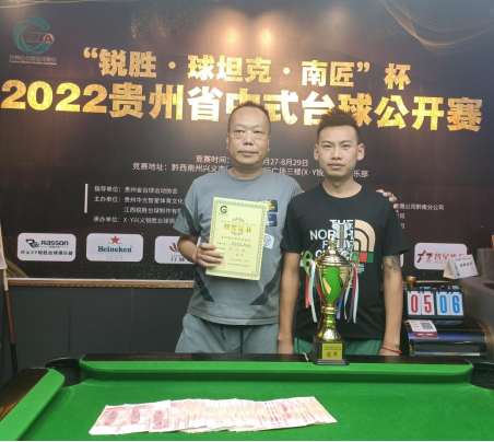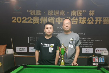 决赛选手胡余(抢8)VS雷军辉(抢7.5)决赛两位选手都是兴义本地知名选手;决赛开始胡余3:0开局,雷军辉顶住压力,稳扎稳打发挥出色连胜5局,比分来到了3:5;接下来的决赛过程中双方你追我赶比赛交替上升;最后老将雷军辉以7:5结束比赛。荣获“锐胜·球坦克·南匠”杯2022贵州省中式台球公开赛(兴义站)冠军。