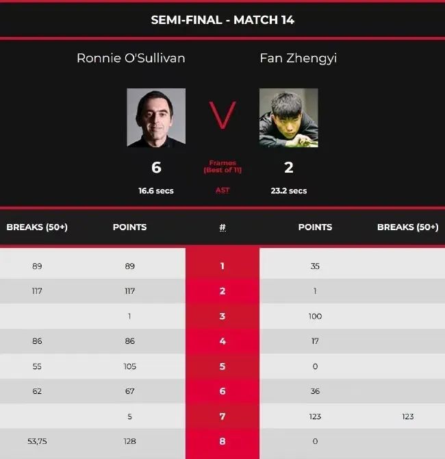 半决赛中,世界排名第一的奥沙利文保持世界第一的水准,前两局就打出了一杆80+和一杆破百,连胜两局。第三局范争一以100-1扳回一局。后续奥沙利文连胜三局率先拿下赛点 。第七局范争一一杆破百以123-5拿下该局,然而第八局奥沙利文发力以128-0赢下此局,最后以6-2的比分顺利晋级决赛。