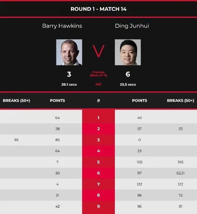 正赛第二日第二时段,丁俊晖对阵英格兰选手巴里·霍金斯。首局,霍金斯以64-40先胜一局,第二局,丁俊晖凭借单杆50+赢回一局,随后两局,霍金斯打出单杆80+,以85(85)-0和64-23连胜两局,大比分3-1领先。