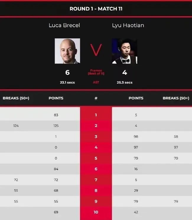 正赛第二日第一时段,吕昊天对阵比利时选手卢卡·布雷切尔。开局布雷切尔就打出单杆破百,以83-5和125(124)-4连胜两局,大比分2-0领先,随后吕昊天凭借3杆50+,以98(58)-1、97(97)-0和79(79)-0连胜三局,大比分3-2反超布雷切尔。