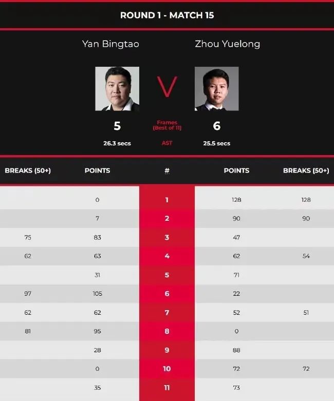 第五局,周跃龙71-31,大比分3-2再次领先。随后,颜丙涛打出3杆60+,105(97)-22、62(62)-52和95(81)-0连胜三局,大比分5-3反超,并率先拿到赛点。关键时刻,周跃龙发力,打出了单杆70+,以88-28、72(72)-0和73-35结束比赛,大比分6-5逆转晋级16强。
