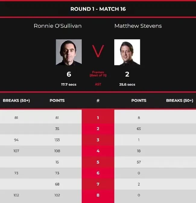 第五局,斯蒂文斯57-15扳回一局。此后,奥沙利文再没给对手机会,凭借1杆破百和1杆70+,以73(73)-0、68-2和102(102)-0,大比分6-2晋级16强。