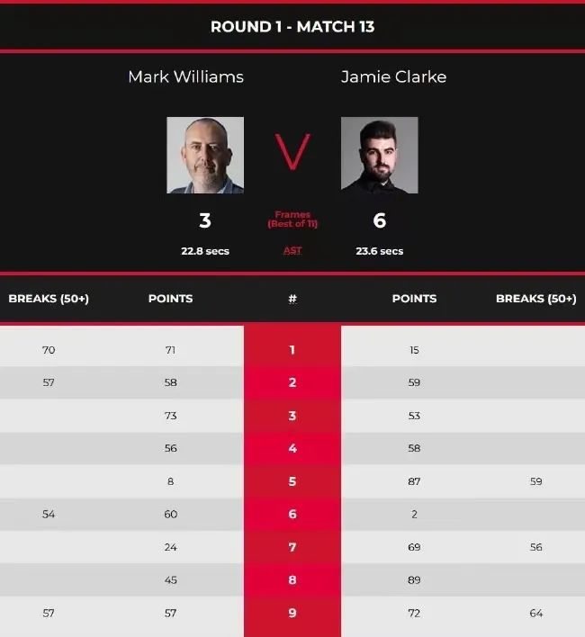 正赛第三日第二时段,马克·威廉姆斯对阵詹姆·克拉克。本场比赛双方一直紧咬比分,首局,威廉姆斯打出单杆70分,先胜一局。第二局虽然威廉姆斯打出了单杆50+,但还是被克拉克以59-58(57)赢下。第三局,威廉姆斯73-53胜出。第四局,克拉克以58-56胜出,大比分2-2。