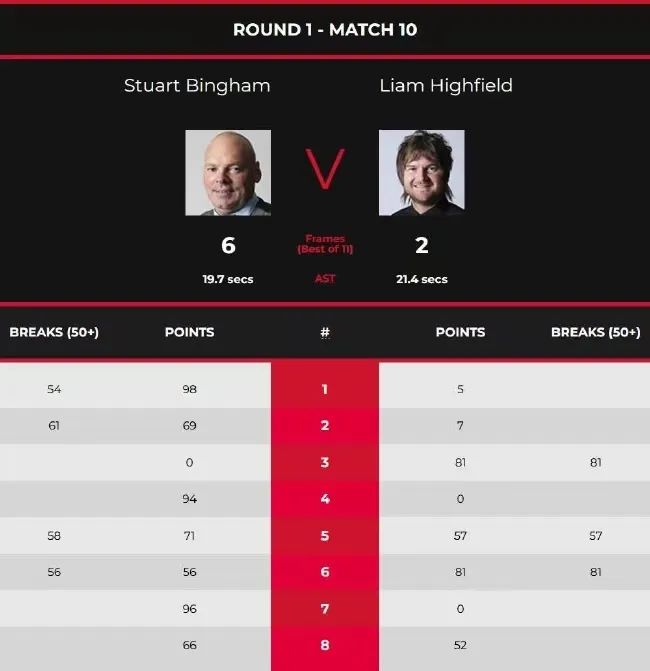 正赛第三日第二时段,斯图亚特·宾汉姆对阵利亚姆·海菲尔德。开局,宾汉姆凭借两杆50+,以98(54)-5和69(61)-7连胜两局,大比分2-0领先。第三局,海菲尔德打出单杆81分,追回一局,大比分2-1。第四局,宾汉姆以94-0胜出。第五局和第六局,双方都打出了两杆50+,以71(58)-57(57)和56(56)-81(81)各胜一局,大比分4-2。随后两局宾汉姆以96-0和66-52连胜,以6-2的大比分晋级16强。