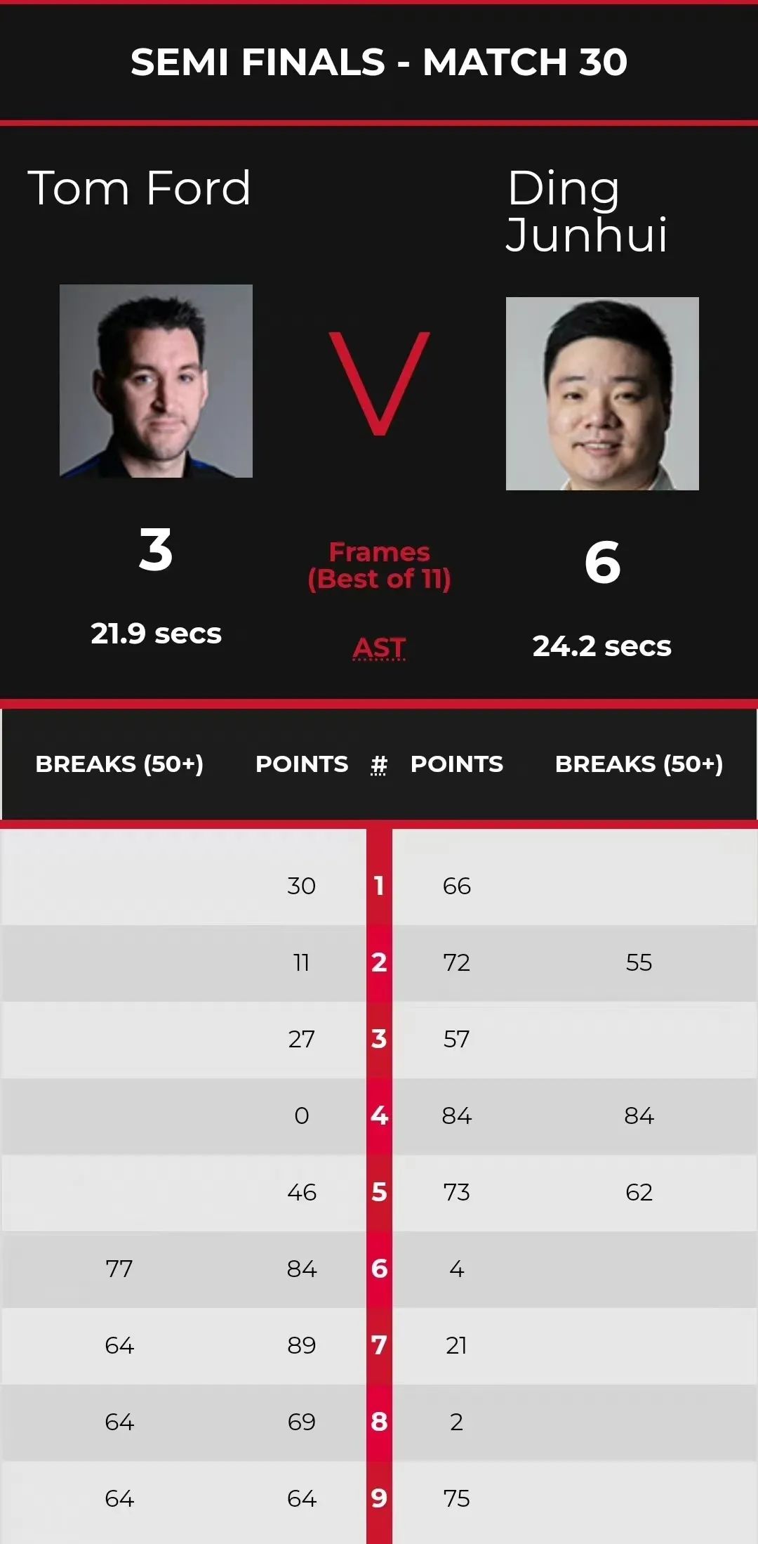 关键时刻,福德凭借3杆60+,以84(77)-4、89(64)-21和69(64)-2连胜三局,连救3个赛点,大比分5-3。第九局,丁俊晖以75-64(64)胜出,大比分6-3晋级决赛。这是丁俊晖职业生涯第四次晋级英锦赛决赛。