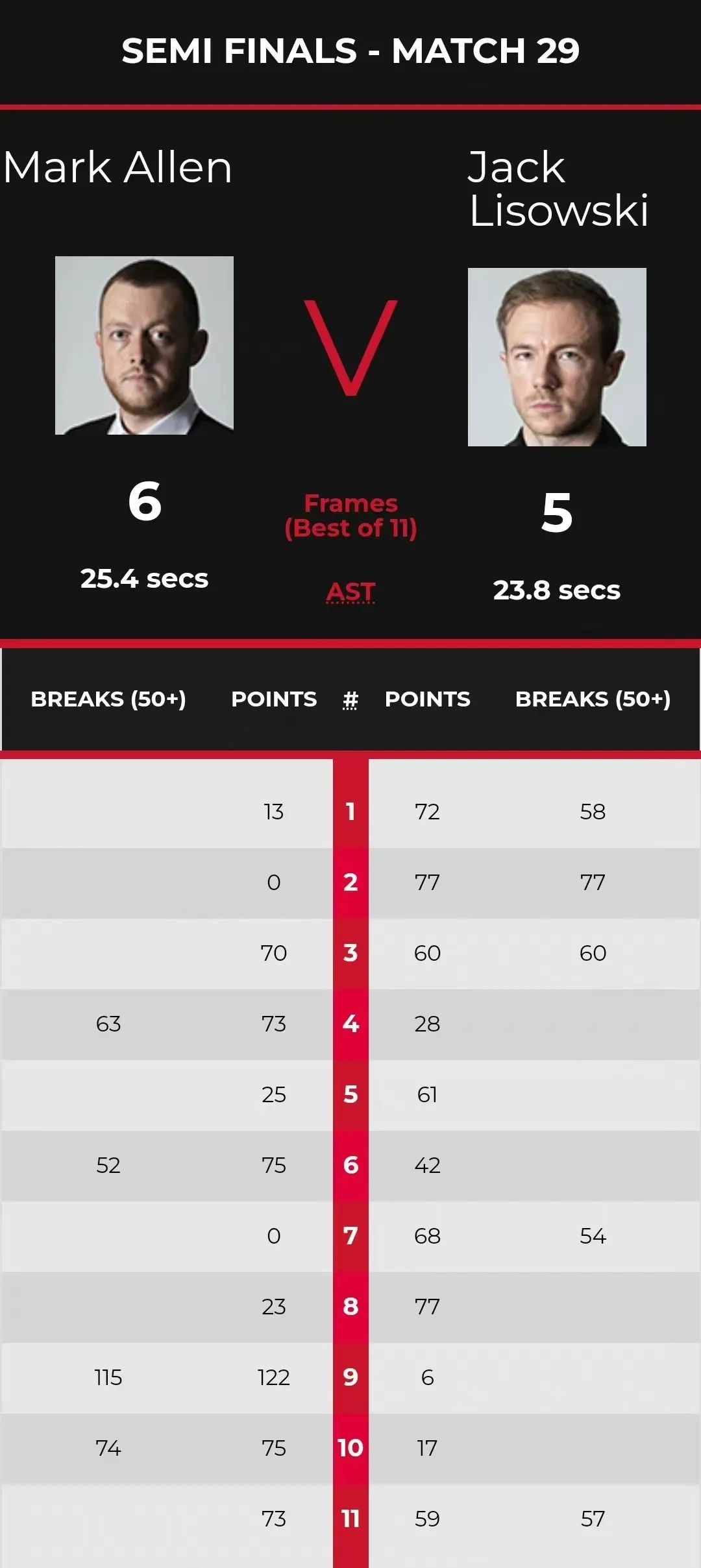 半决赛第二场比赛,马克·艾伦对阵杰克·利索夫斯基。开局,利索夫斯基就打出2杆50+,以72(58)-13和77(77)-0连胜两局,大比分2-0领先。此后,艾伦打出了1杆60+,以70-60(60)和73(63)-28连胜两局,大比分2-2追平。第五局,利索夫斯基以61-25赢下一局,大比分3-2领先。