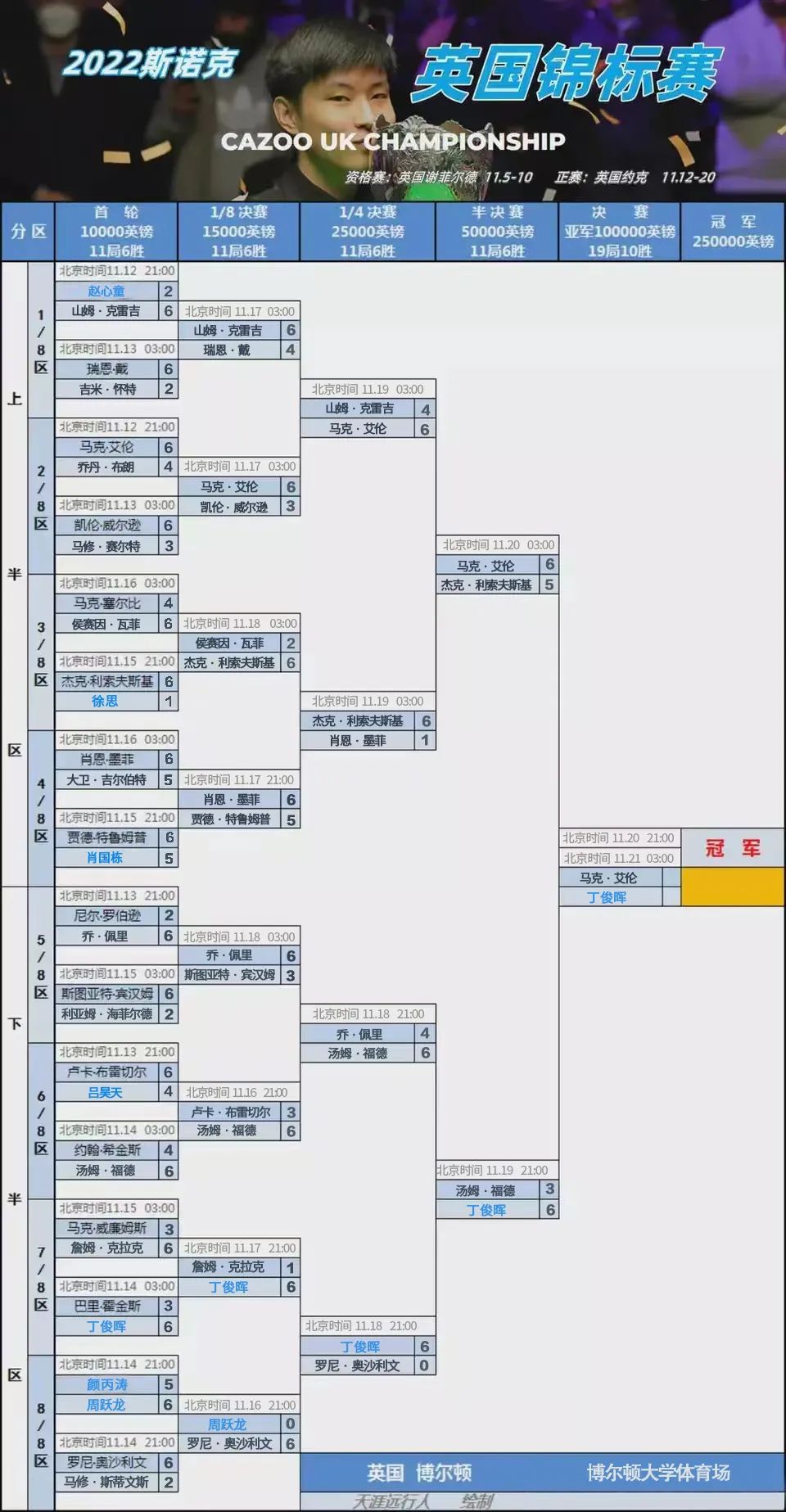 截至11月20日,2022英锦赛决赛选手诞生,分别是丁俊晖和马克·艾伦。
