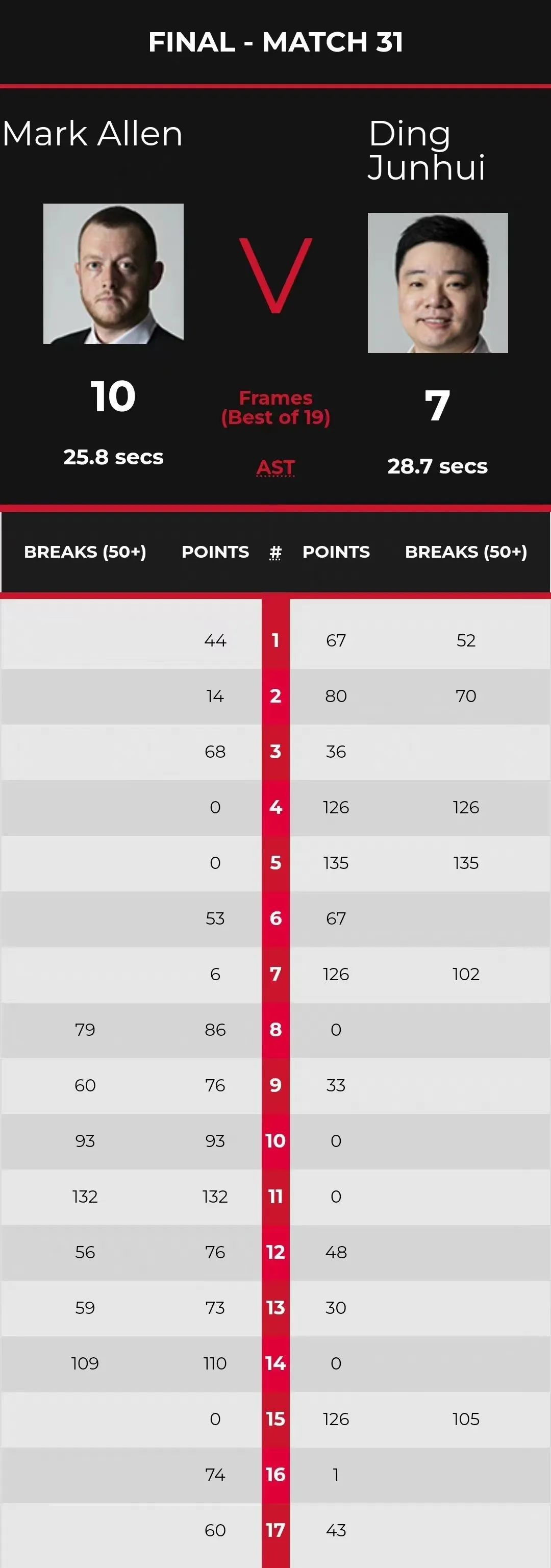 中场休息过后,艾伦火力全开,打出了2杆破百合4杆50+。以86(79)-0、76(60)-33、93(93)-0、132(132)-0、76(56)-48、73(59)-30和110(109)-0连胜七局,大比分9-6反超。