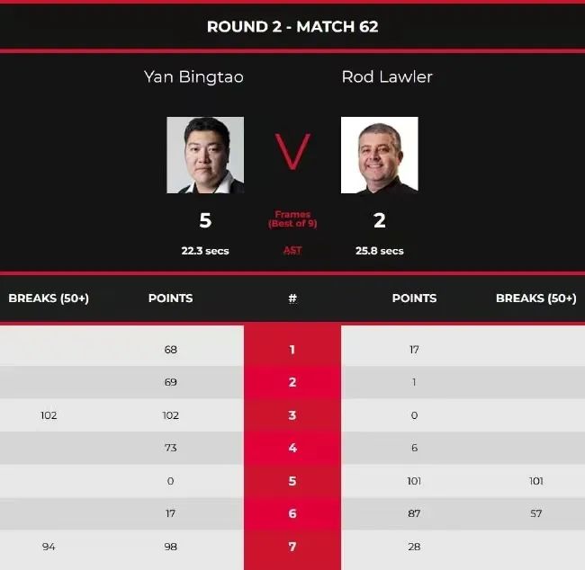 此后,劳勒凭借1杆破百和1杆50+,以101(101)-0和87(57)-17连胜两局,大比分4-0救回两个赛点。第七局,颜丙涛打出单杆94分,以98(94)-28胜出,大比分5-2晋级资格赛第三轮。