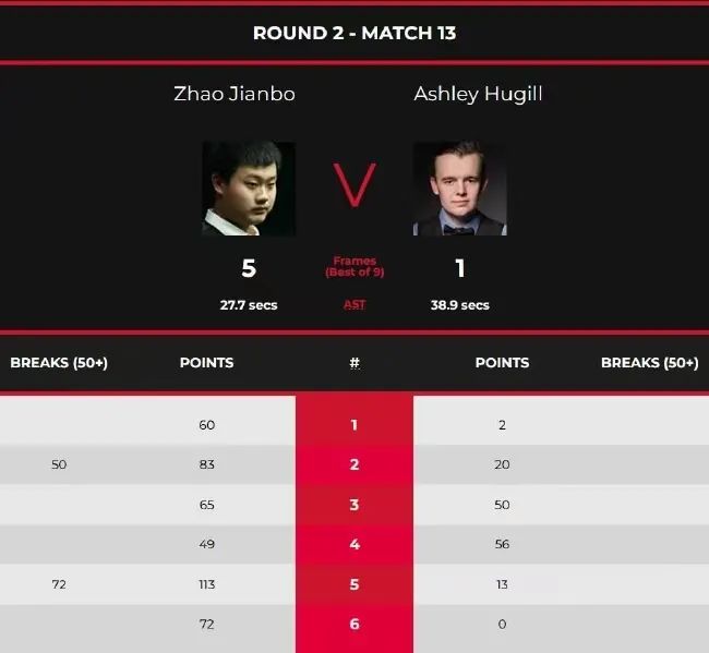 第四局,休吉尔以56-49扳回一局,大比分3-1。随后,赵剑波打出单杆73分,以113(72)-13和72-0连胜两局,大比分5-1晋级资格赛第三轮。