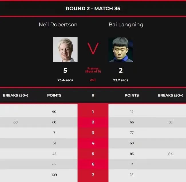 第五局,白朗宁打出单杆84分,以85(84)-42再扳一局,大比分3-2。此后,罗伯逊以65-13和109-18连胜两局,大比分5-2晋级资格赛第三轮。