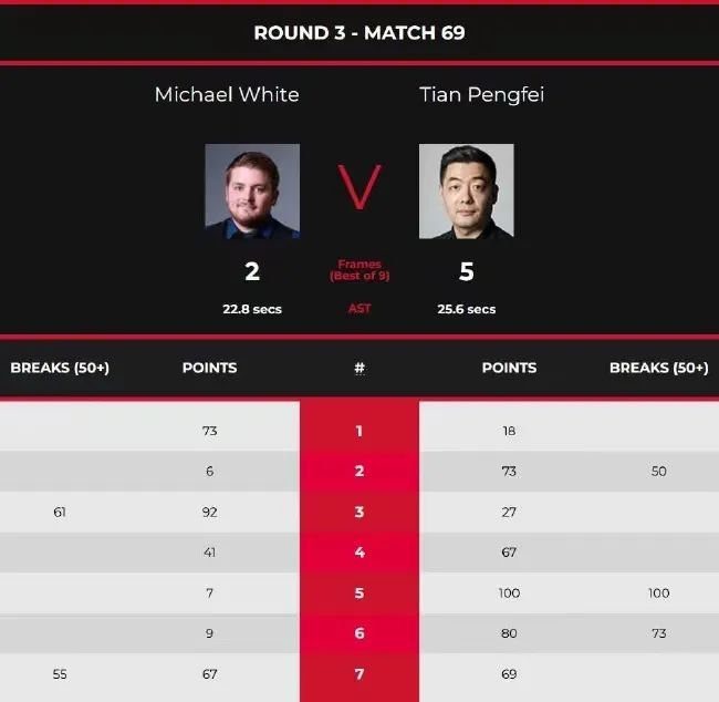 资格赛第二日第二时段,进行的是资格赛第三轮的比赛田鹏飞对阵迈克尔·怀特。首局,怀特以73-18先胜一局。第二局,田鹏飞打出单杆50分,以73(50)-6扳平。第三局,怀特打出单杆61分,以92(61)-27胜出,大比分2-1领先。