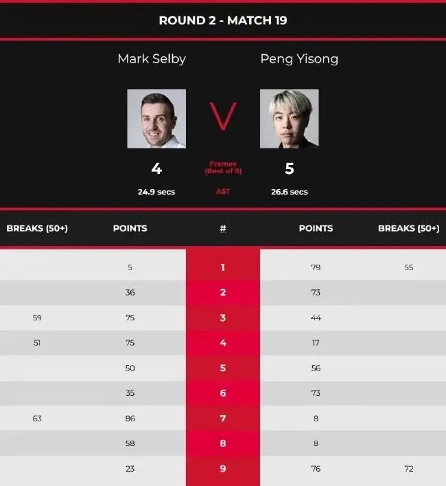 中场休息过后,彭奕淞以56-50和73-35连胜两局,大比分4-2率先拿到赛点。随后,塞尔比凭借单杆63分,以86(63)-8和58-8连胜两局,救回两个赛点,大比分4-4扳平来到决胜局。决胜局中,彭奕淞凭借单杆72分,以76(72)-23胜出,大比分5-4晋级资格赛第三轮。