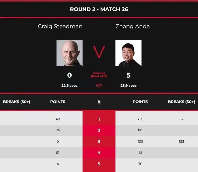 资格赛第三日第一时段,张安达对阵克雷格·斯泰德曼。本场比赛,张安达打出了1杆破百和1杆50+,以63(57)-48、88-74、133(133)-0、61-51和70-4连胜五局,大比分5-0晋级资格赛第三轮。