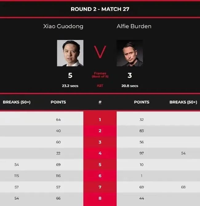 资格赛第三日第一时段,肖国栋对阵阿尔菲·博登。前四局,比分为(肖国栋在前)64-32、40-83、60-56和22-97(54)双方各胜2局,大比分2-2。