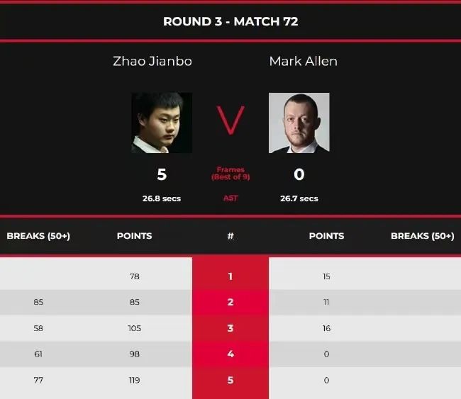 资格赛第三日第二时段,赵剑波对阵马克·艾伦。整场比赛,赵剑波打出了4杆50+,以78-15、85(85)-11、105(58)-16、98(61)-0和119(77)-0连胜五局,大比分5-0击败2022英锦赛冠军马克·艾伦,晋级正赛。
