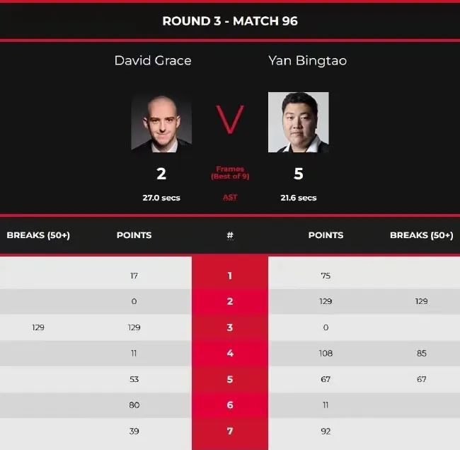 资格赛第三日第二时段,颜丙涛对阵大卫·格雷斯。开局,颜丙涛打出了单杆129分,以75-17和129(129)-0连胜两局,大比分2-0领先。第三局,格雷斯打出单杆129分,以129(129)-0扳回一局,大比分1-2。随后,颜丙涛凭借2杆60+,以108(85)-11和67(67)-53连胜两局,率先拿到赛点。