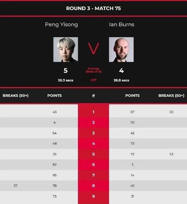 资格赛第三日第二时段,彭奕淞对阵伊安·伯恩斯。开局,伯恩斯打出了单杆50+,以57(50)-43和70-4连胜两局,大比分2-0领先。第三局,彭奕淞以54-43扳回一局,大比分1-2。随后,伯恩斯打出单杆50+,以73-48和72(53)-25连胜两局,大比分4-1率先拿到赛点。