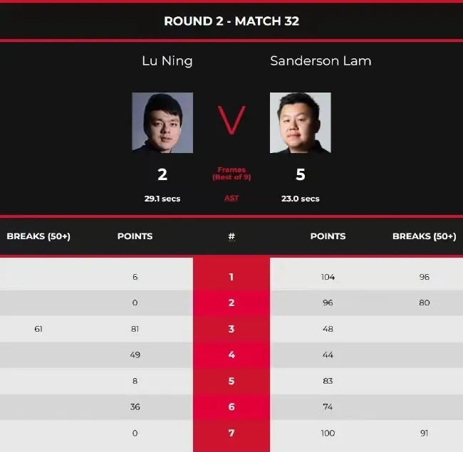 资格赛第三日第三时段, 鲁宁对阵林杉峰。开局,林杉峰打出了2杆80+,以104(94)-6和96(80)-0先胜两局,大比分2-0领先。随后,鲁宁凭借1杆60+,以81(61)-48和49-44连胜两局,大比分2-2扳平比分。