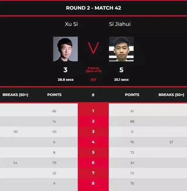 第六局,徐思以97(54)-34扳回一局,大比分3-3扳平。此后斯佳辉以72-22和75-9连胜两局,大比分5-3晋级资格赛第三轮。