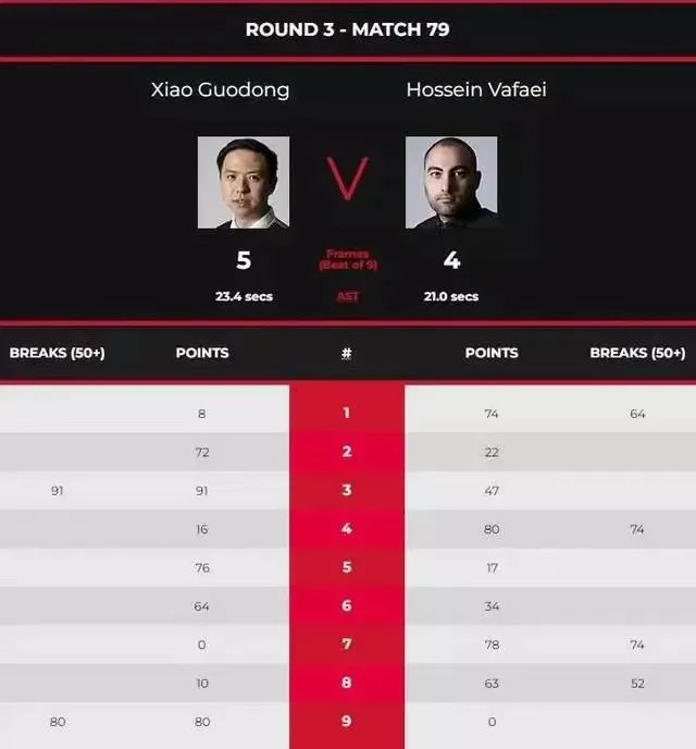 中场休息回来后,肖国栋以76-17和64-34连胜两局,大比分4-2率先拿到赛点。随后,瓦菲凭借两杆50+,以78(74)-0和63(52)-10连救两个赛点,大比分4-4平。决胜局中,肖国栋凭借单杆80分,以80(80)-0胜出,大比分5-4晋级正赛。