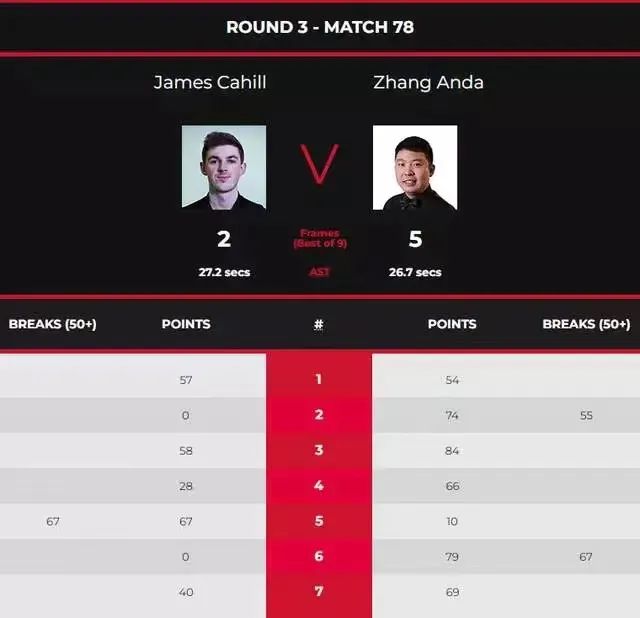 中场休息回来后,卡希尔凭借单杆67分,以67(67)-10扳回一局。此后,张安达凭借一杆67分,以79(67)-0和69-40胜出,大比分5-2晋级正赛。