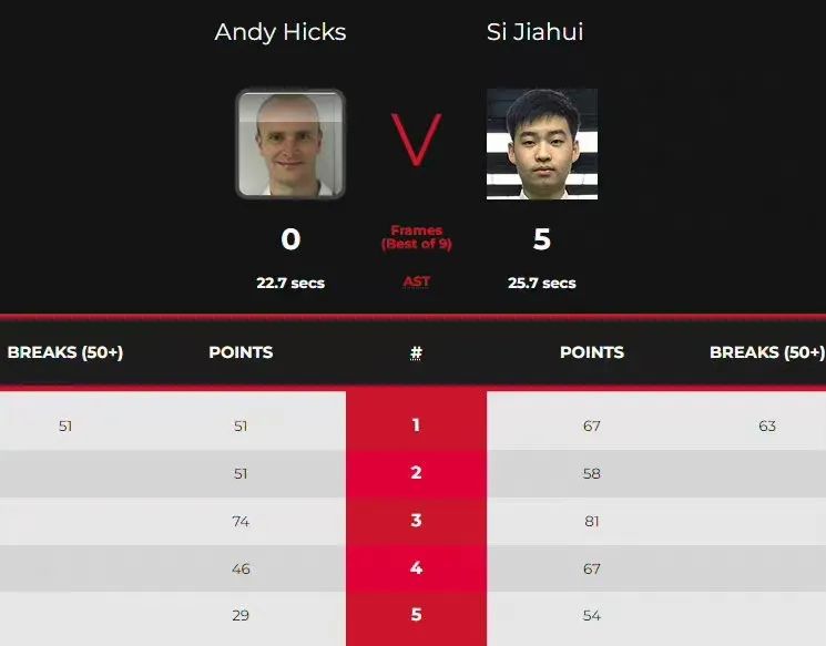 资格赛第六日第一时段,斯佳辉对阵安迪·希克斯。斯佳辉本场比赛发挥良好,以67(63)-51(51)、58-51、81-74、67-46和54-29连胜五局,大比分5-0拿下比赛,顺利晋级正赛。