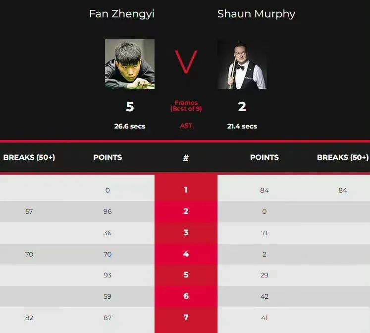 资格赛第六日第一时段,范争一对阵肖恩·墨菲。前四局,双方都打出了单杆50+,以(范争一在前)0-84(84)、96(57)-0、36-71和70(70)-2大比分2-2平。