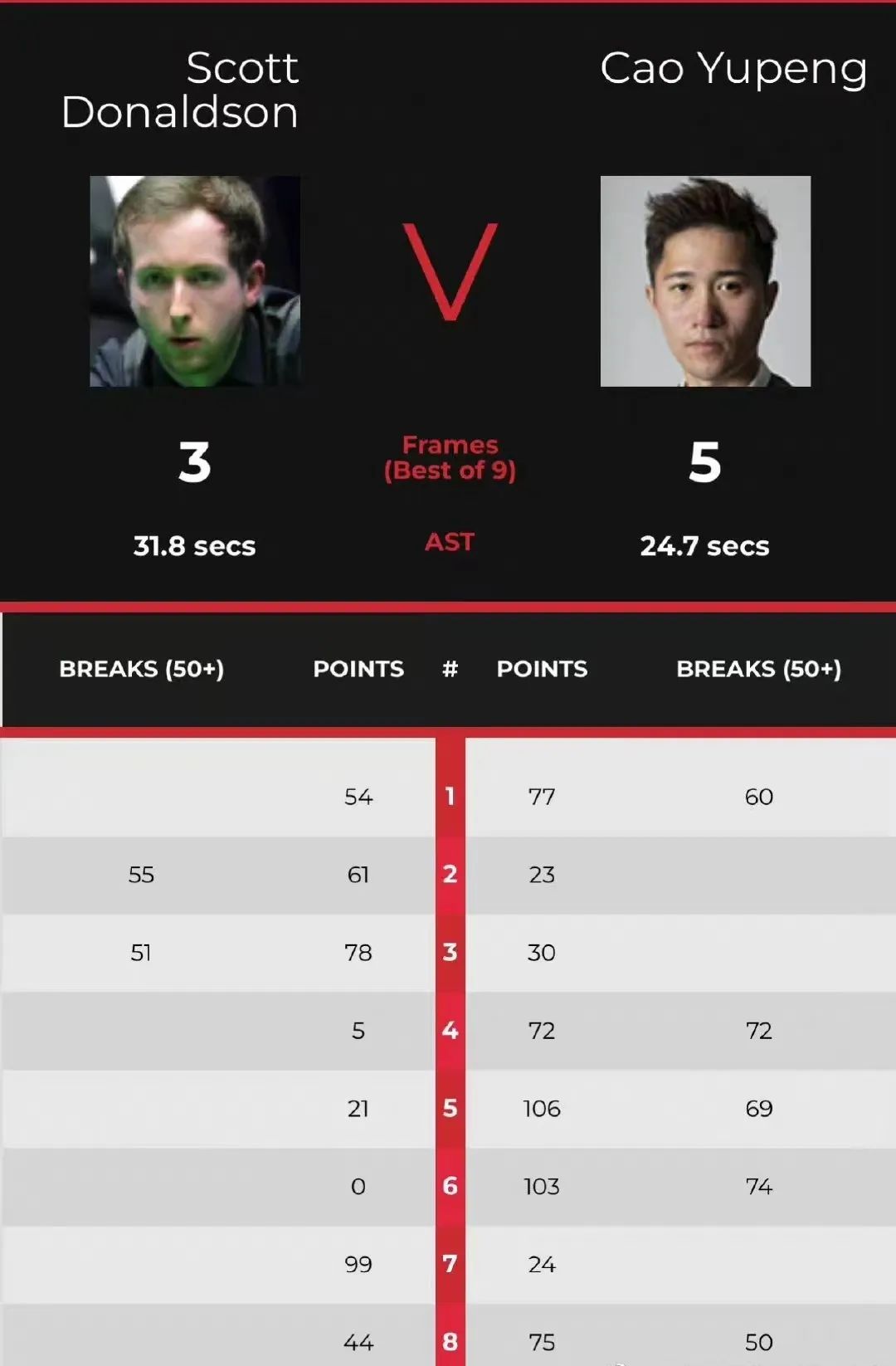 资格赛第六日第二时段,曹宇鹏对阵斯科特·唐纳森。首局,曹宇鹏打出单杆60+,以77(60)-54先胜一局。随后,唐纳森打出了2杆50+,以61(55)-23和78(51)-30连胜两局,大比分2-1领先。