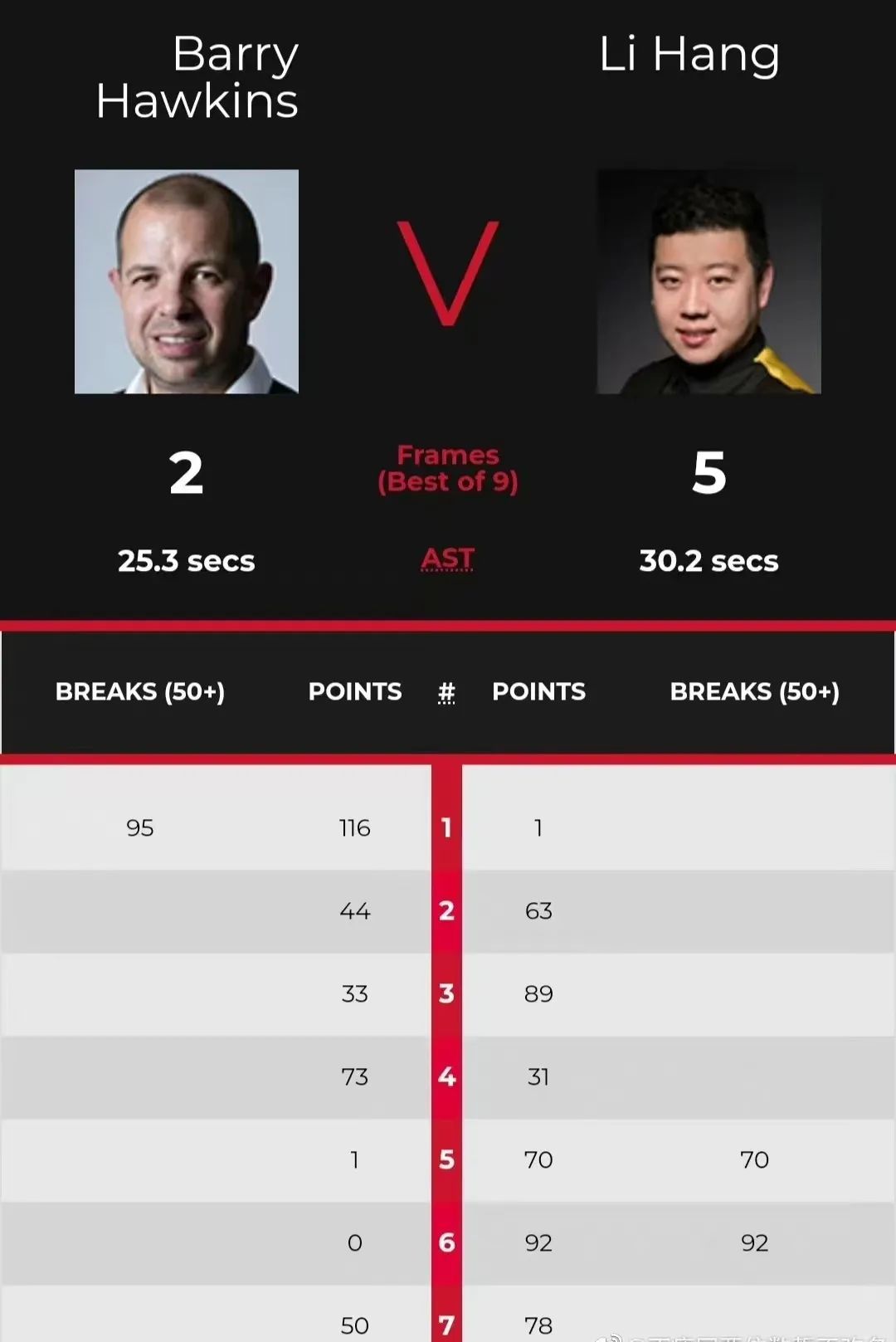 资格赛第六日第三时段,李行对阵巴里·霍金斯。首局,霍金斯凭借单杆95分,以116(95)-1先胜一局。随后,李行以63-44和89-33连胜两局,大比分2-1领先。第四局,霍金斯以73-31胜出,大比分2-2平。