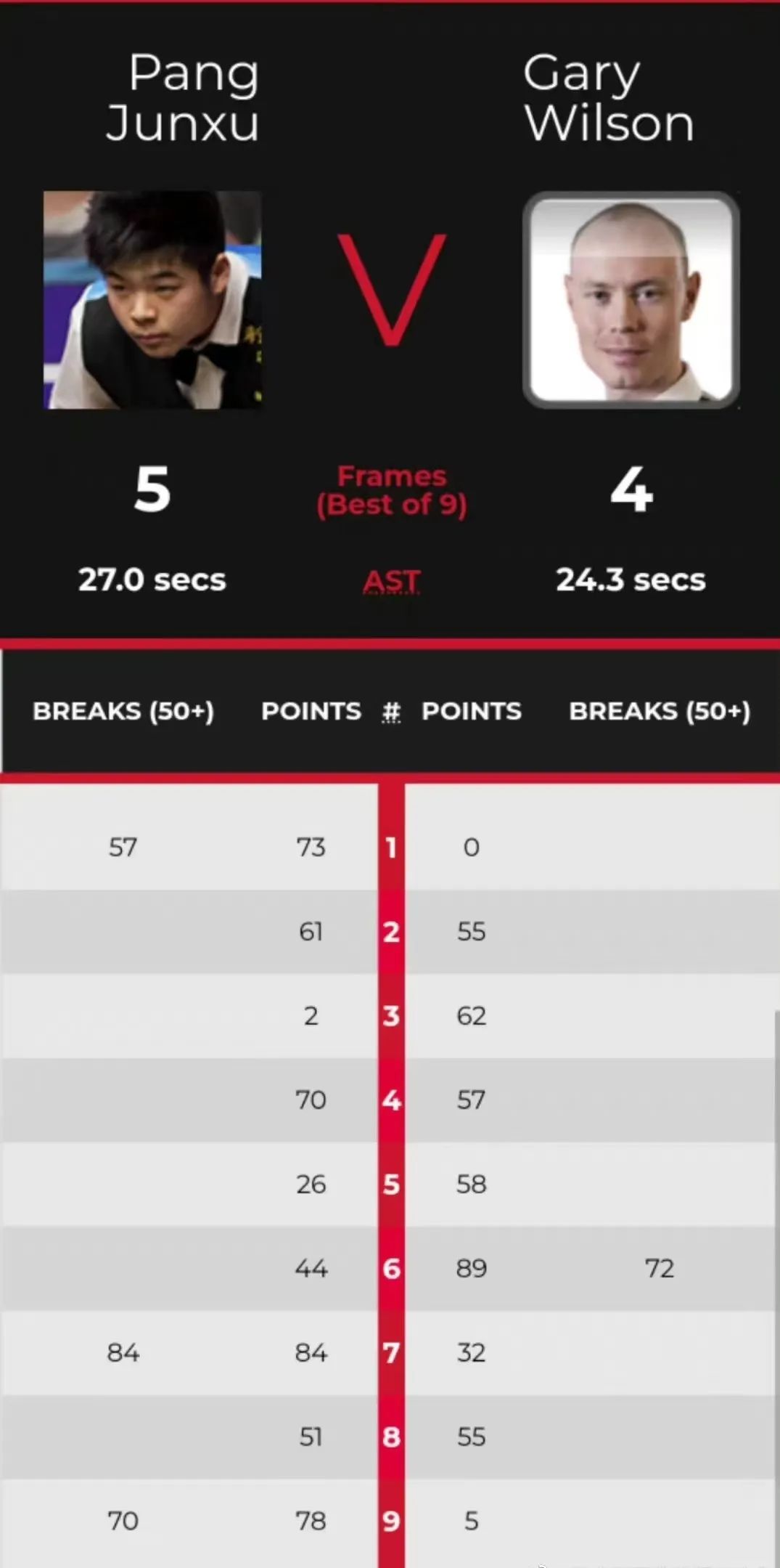 资格赛第六日第三时段,庞俊旭对阵加里·威尔逊。开局,庞俊旭打出了1杆50+,以73(57)-0和61-55连胜两局,大比分2-0领先。第三局,威尔逊以62-2扳回一局,大比分1-2。第四局,庞俊旭以70-57再胜一局,大比分3-1保持领先。