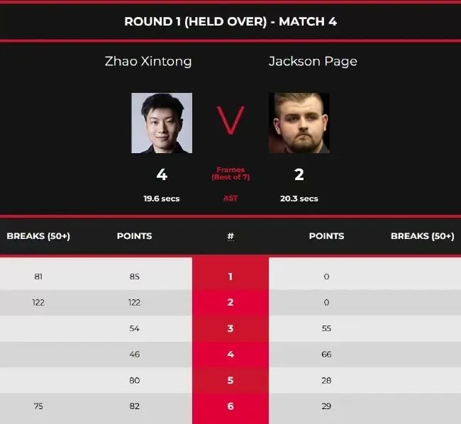正赛首日延迟资格赛,第一时段,赵心童对阵J.佩奇。赵心童凭借1杆破百和2杆70+,以85(81)-0、122(122)0、54-55、46-66、80-28和82(75)-29,大比分4-2战胜杰克逊·佩奇,晋级正赛。