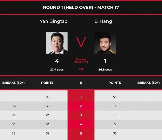 正赛首日延迟资格赛,第一时段,颜丙涛对阵李行。开局,李行以53-40先胜一局。此后,颜丙涛打出1杆破百和3杆50+,以136(136)-0、72(72)-15、80(53)-8和68(68)-35连胜四局,大比分4-1逆转晋级正赛。