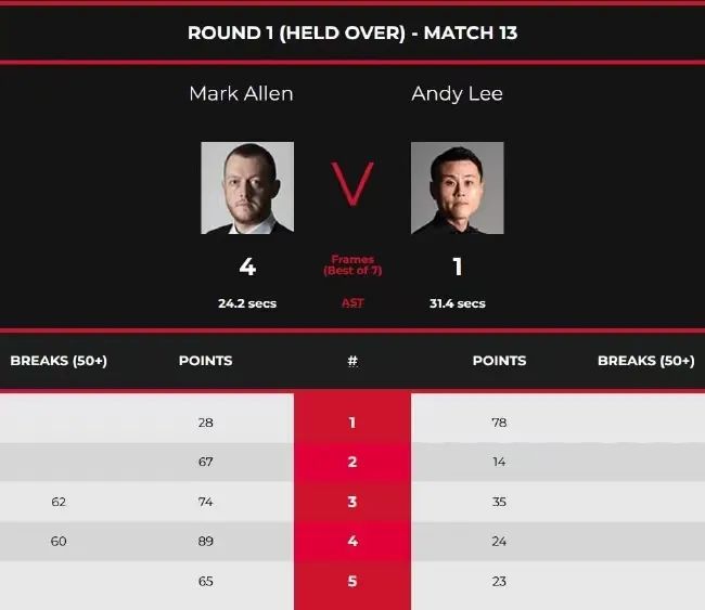 正赛首日延迟资格赛,第二时段,李俊威对阵马克·艾伦。开局,李俊威以78-28先胜一局。此后,艾伦凭借2杆60+,以67-14、74(62)-35、89(60)-24和65-23连胜4局,大比分4-1晋级正赛。