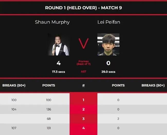 正赛首日延迟资格赛,第四时段,雷佩凡对阵肖恩·墨菲。比赛中雷佩凡几乎没有上场的机会,墨菲凭借3杆破百,以100(100)-0、136(104)-0、68-2和131(107)-0连胜四局,大比分4-0晋级正赛。