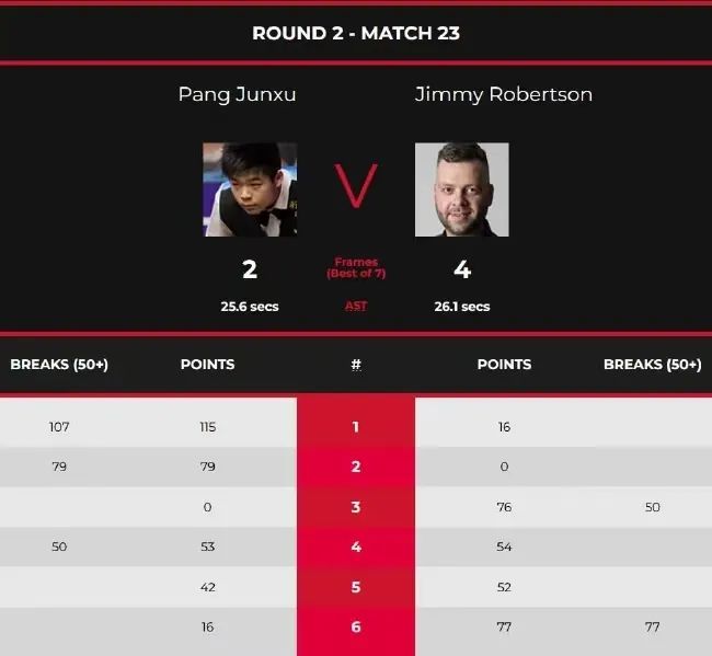 第五时段,庞俊旭对阵吉米·罗伯逊。开局,庞俊旭凭借1杆破百和1杆70+,以115(107)-16和79(79)-0连胜两局,大比分2-0领先。