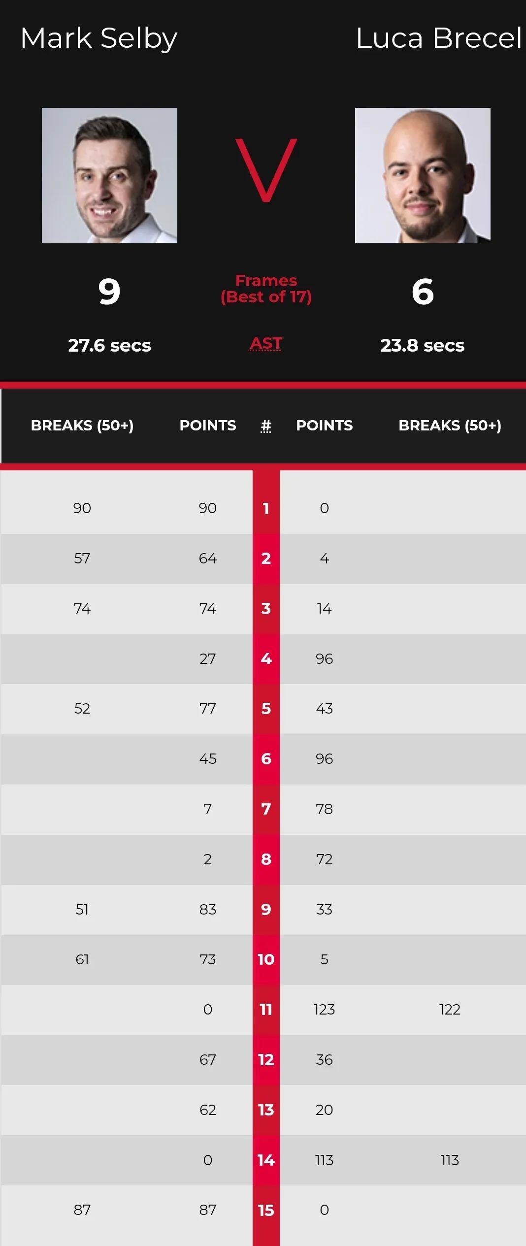 英格兰公开赛决赛,马克·塞尔比对阵卢卡·布雷塞尔。