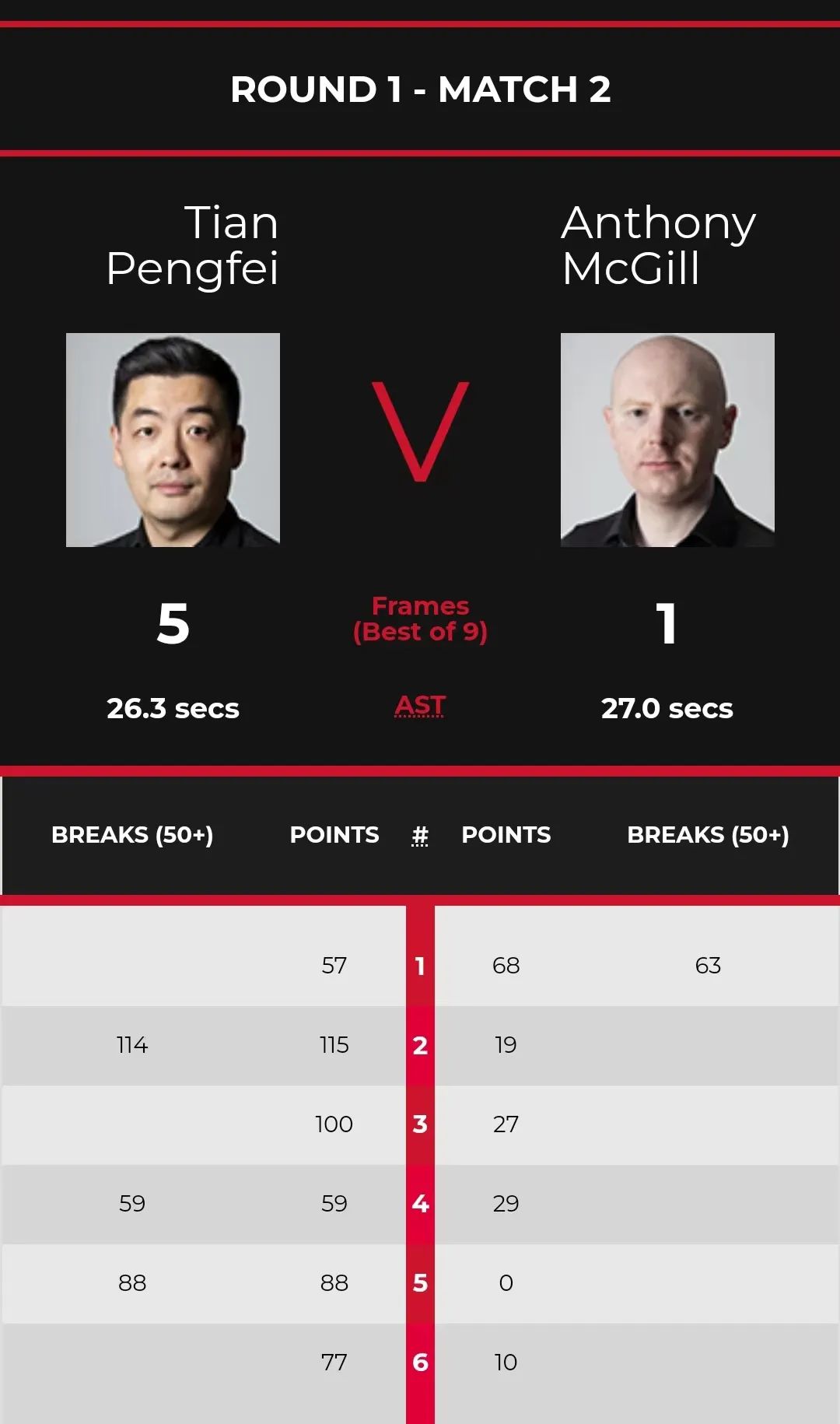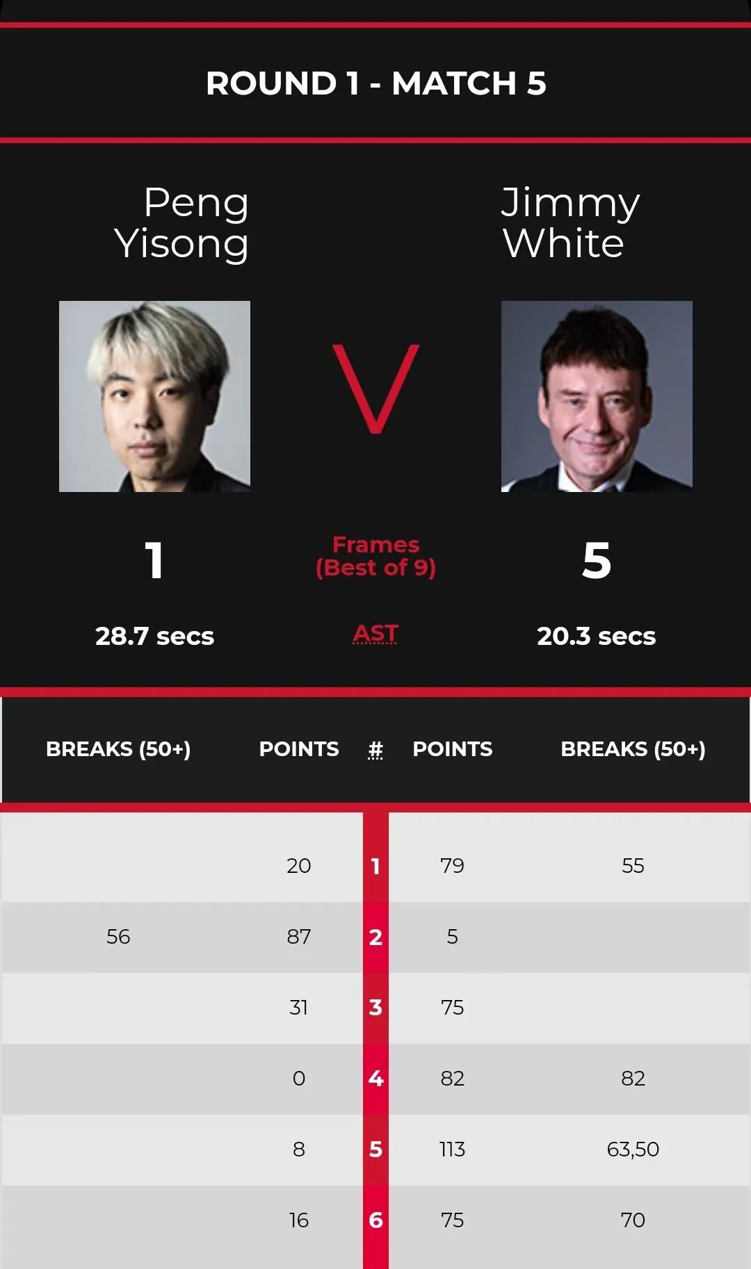 本场比赛的选手应该是整个赛场上年龄差最大的一组选手,00后小将彭奕淞对阵61岁的老将吉米·怀特。怀特打出了5杆50+,以5-1的大比分晋级16强。成为了近年来首位以60岁以上高龄打进排名赛16强的球员。