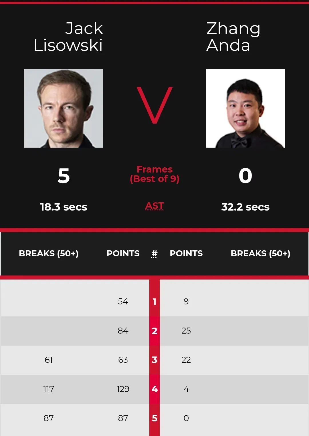 本场比赛,利索夫斯基状态良好,打出了单杆117分、63分和87分,以绝对的比分零封张安达晋级16强。