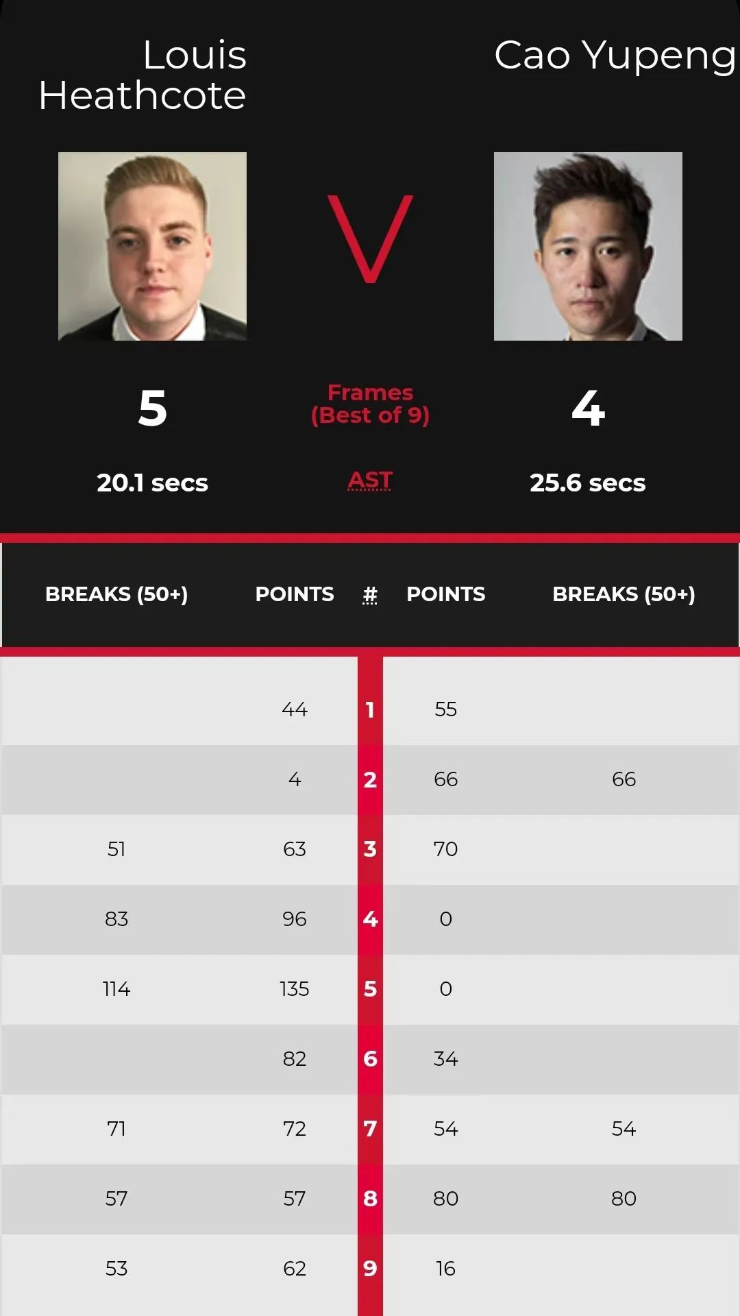 曹宇鹏的情况和斯佳辉一样,在3-0领先的情况下,被希斯科特以1杆破百和2杆50+连胜4局,4-3率先拿到赛点。第八局,曹宇鹏凭借单杆80分救回一个赛点,来到决胜局。决胜局希斯科特以62(53)-16拿下比赛,大比分5-4晋级16强。