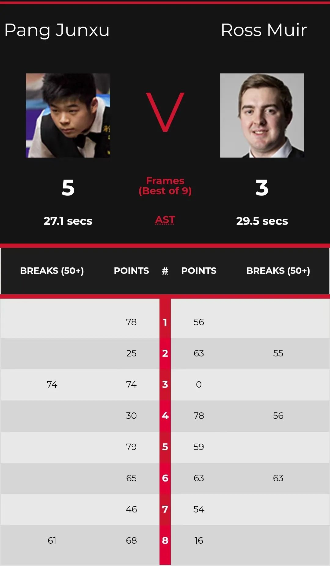 本场比赛庞俊旭以4-2的比分率先拿到赛点,第七局,缪尔以54-46追回一个赛点,第八局,庞俊旭凭借单杆61分拿下比赛,大比分5-3顺利晋级16强。