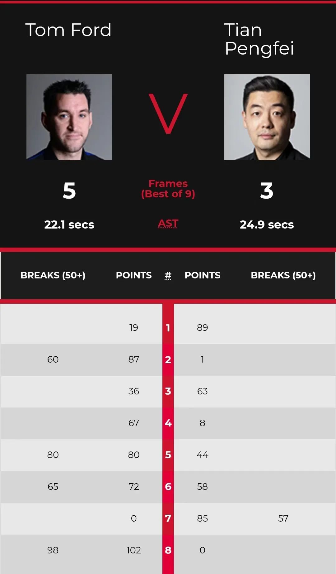 本场比赛福德凭借4杆60+,以5-3的大比分晋级8强,田鹏飞遗憾止步16强。
