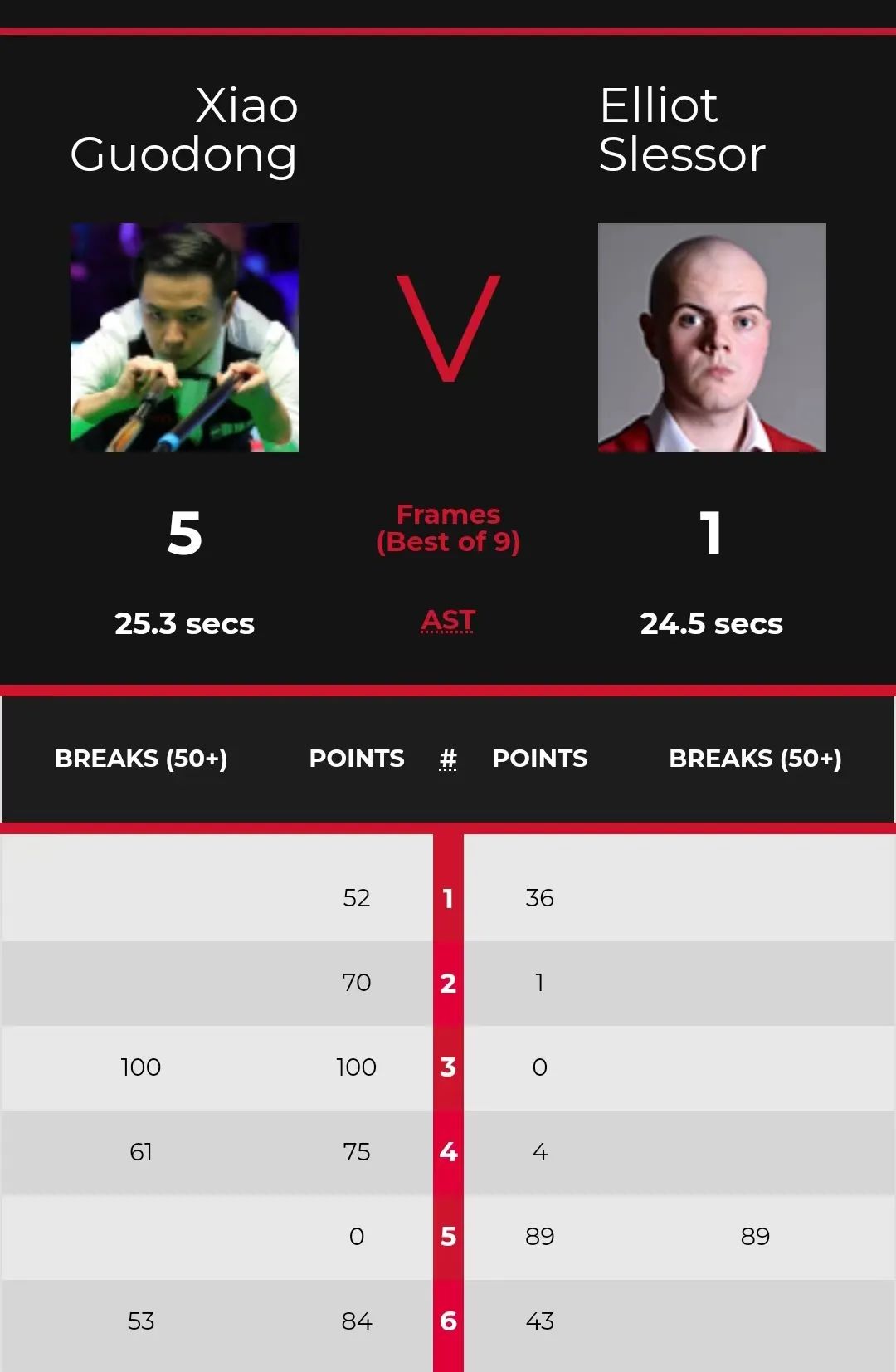肖国栋稳定输出,凭借单杆100分和61分连胜4局,大比分4-0率先拿到赛点。第五局,斯莱赛打出单杆89分救回一个赛点,大比分4-1。第六局,肖国栋凭借单杆53分大比分5-1结束比赛,成功晋级8强。