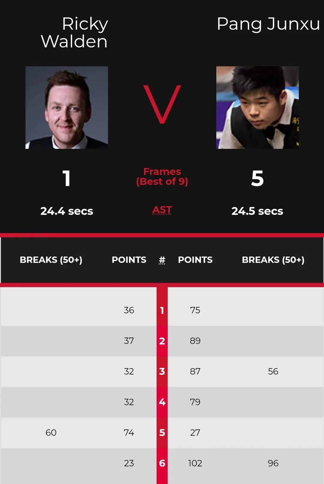 庞俊旭本场比赛稳定发挥,打出单杆56分连胜四局,大比分4-0率先拿到赛点。第五局,沃顿凭借单杆60分追回一局。第六局,庞俊旭打出单杆96分,以5-1的大比分晋级8强。