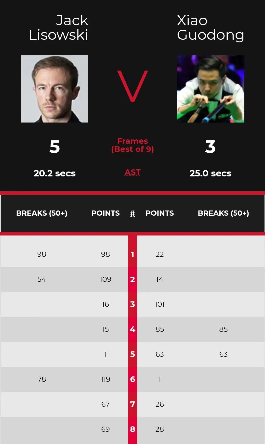 开局,利索夫斯基打出2杆50+,大比分2-0领先。随后,肖国栋凭借2杆60+,以3-2的比分反超。此后,利索夫斯基连胜三局大比分5-3击败肖国栋,晋级4强。
