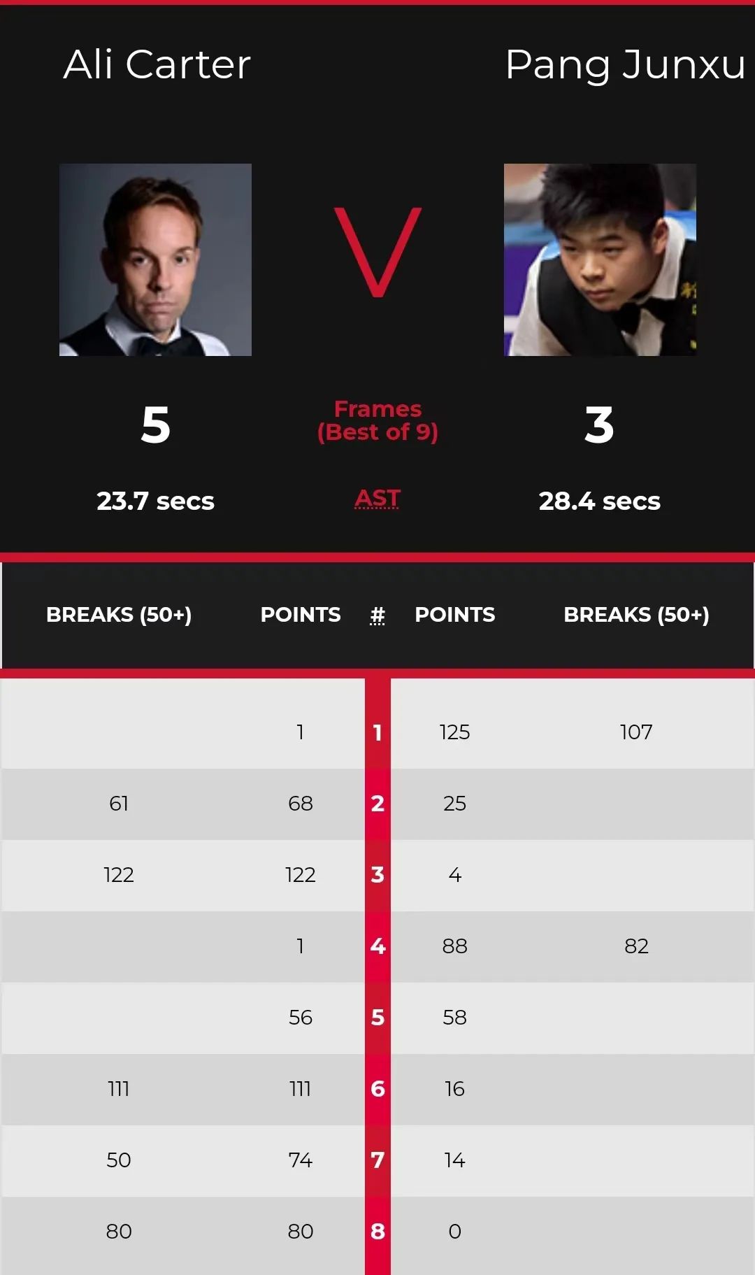 庞俊旭开局打出单杆破百,1-0领先。随后,卡特以1杆破百和1杆60+,2-1反超。庞俊旭接着发力连胜两局,3-2再次领先。最后阶段,卡特凭借1杆破百和2杆50+连胜三局,大比分5-3淘汰了庞俊旭,晋级4强。