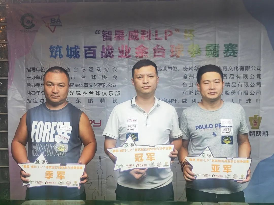 流云时光锐胜台球俱乐部站:冠军龚连凯、亚军张俊、季军陈飞。